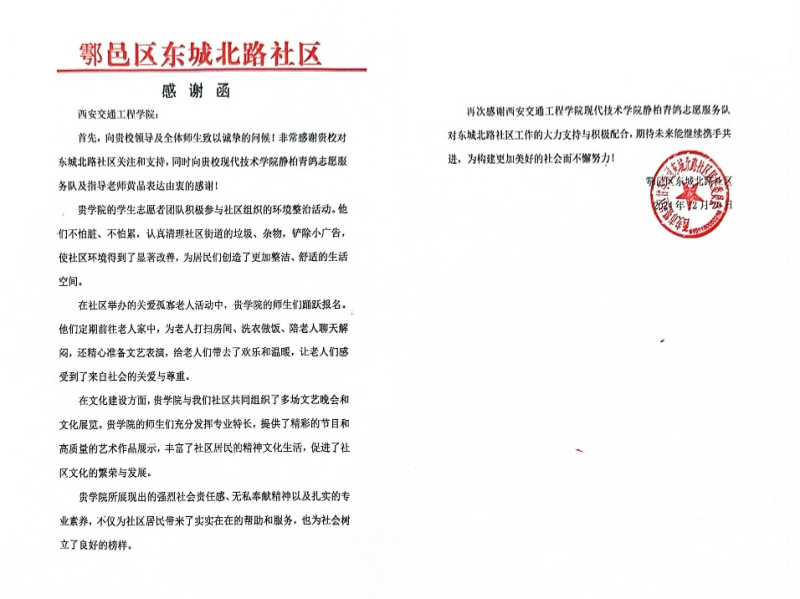 近日,ky开元集团官网现代技术学院静柏青鸽青年志愿服务队收到了鄠邑区甘亭街道东城北路社区发来的感谢函,对该志愿服务队在社区建设与服务中积极承担志愿服务工作给予充分的肯定,对ky开元集团官网学生培养事业给予高度评价。