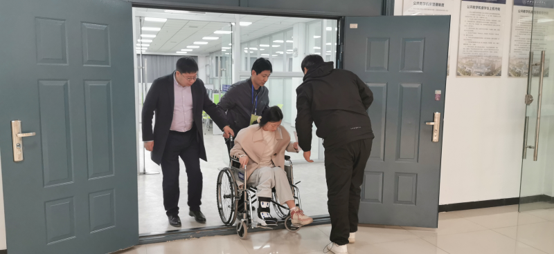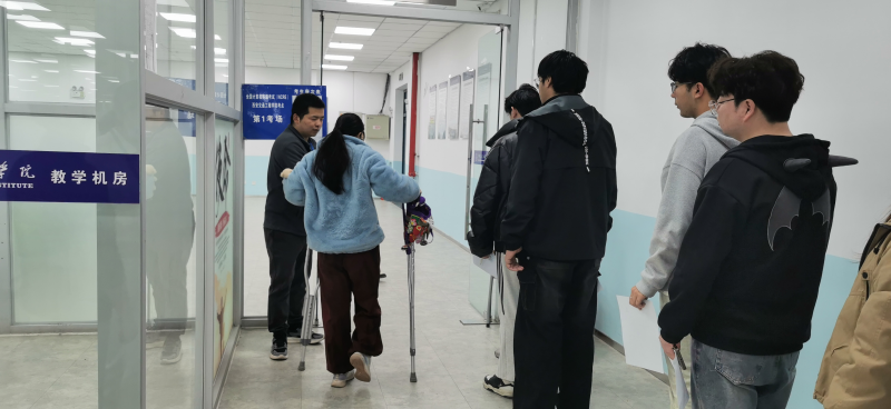 考试当日两名特殊考生带伤赴考。考务组立即启动特殊考生保障预案,开辟无障碍绿色通道,安排专人全程护送。安保人员提前拆除隔离栏扩大通行空间,监考教师主动调整考场座位布局,确保两位考生与其他考生同步开考。