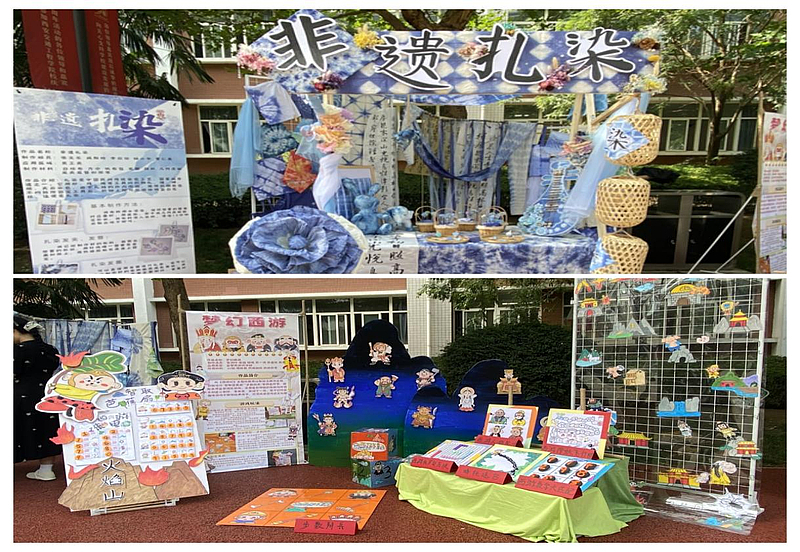 本次评选中学生以儿童立体书、剪纸、书法、综合材料等形式,生动呈现了红船精神、乡村振兴、航天成就等时代画卷。在党建主题展区,学前教育专业学生创作的《奋进新征程》系列剪纸作品,以传统剪纸艺术的艺术语言再现了党的光辉历程,传递了“红色基因代代传”的育人理念。美术技艺展区非遗手工艺作品和自制玩教具展现了专业教学成果。《非遗扎染》在继承非遗技艺的基础上大胆创新,构建了沉浸式非遗体验场景,直观呈现扎染技艺的工艺美学;《梦幻西游》用“火焰山”立牌与“步数用兵”地垫将经典IP转化为可玩性强的教具,透明网格展架的人物贴纸设计更激发儿童想象力,诠释了“传统与现代交融”的美育理念。以上作品既体现了学生扎实的美术功底,更充分彰显了学前教育专业“理论实践一体化”的教育理念。