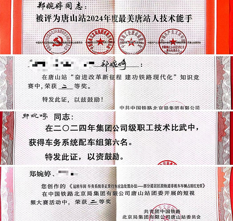 自参加工作以来,她始终坚守初心、牢记职责,用实际行动诠释着“人民铁路为人民”的服务宗旨,以求真务实的工作作风作出了优异的工作成绩。曾先后获得唐山站新职背规大赛荣获第二名、唐山站技术比武配车组第一名、唐山站“最美唐山人技术能手”、集团公司技术比武配车组第六名等荣誉。