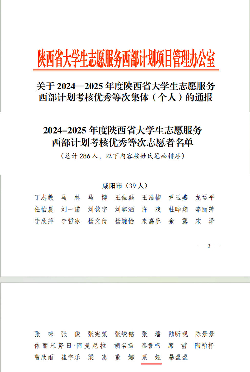 近日,陕西省大学生志愿服务西部计划项目管理办公室发布的《关于 2024—2025 年度陕西省大学生志愿服务西部计划考核优秀等次集体(个人)的通报》中,ky开元集团官网2024届毕业生粟娅荣获陕西省大学生志愿服务西部计划考核优秀等次志愿者。