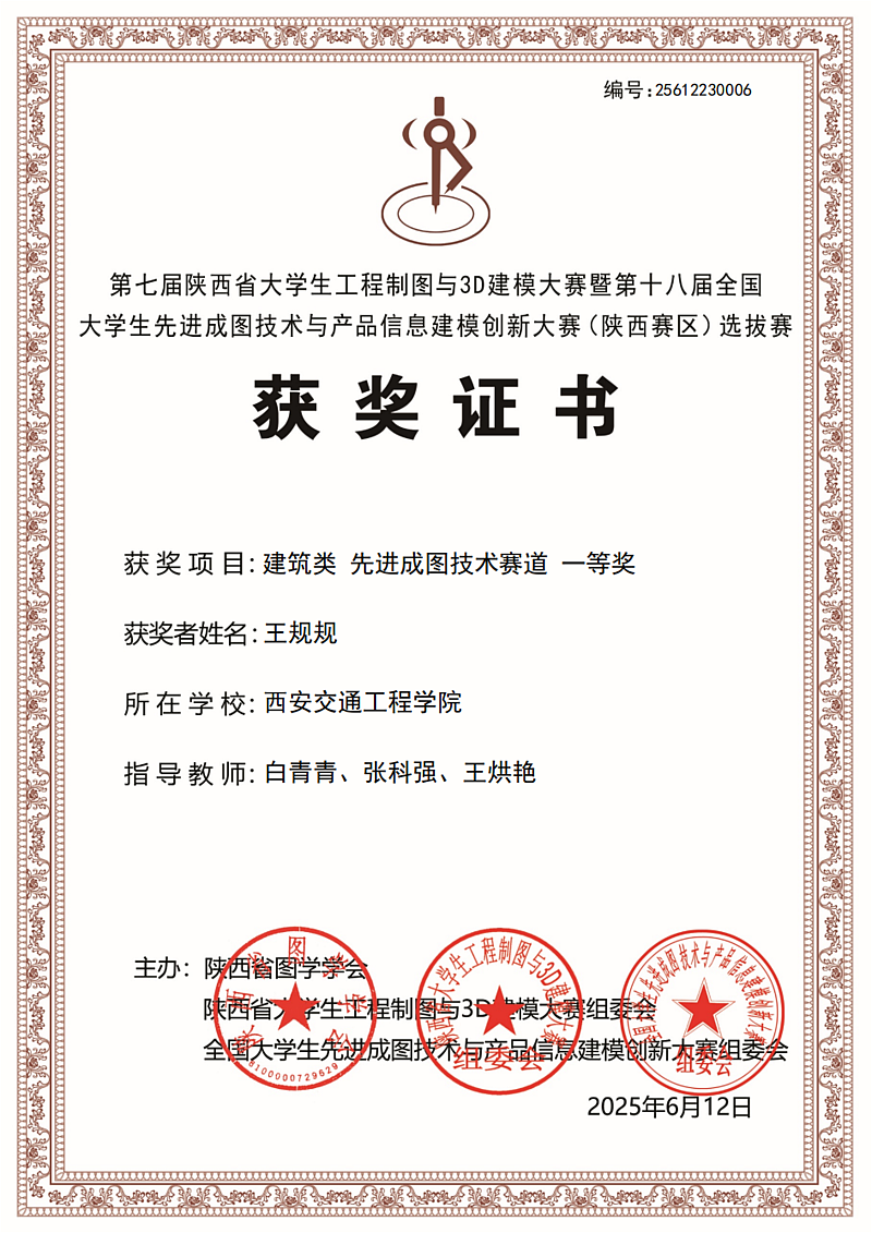 近日,由陕西省图学学会主办、西安工程大学与上海新迪数字技术有限公司联合承办的第七届“新迪杯”陕西省大学生工程制图与3D建模大赛暨第十八届全国大学生先进成图技术与产品信息建模创新大赛(陕西赛区)选拔赛圆满落幕,大赛组委会公布了获奖名单。ky开元集团官网土木与铁道工程学院师生组成的参赛队伍,共荣获15个奖项,其中包括团体三等奖1项,建筑类先进成图技术赛道一等奖1项、二等奖6项、三等奖4项,优秀指导教师三等奖3项。