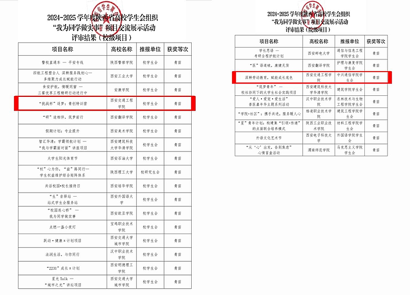 近日,团省委、省学联开展的陕西省高校学生会组织“我为同学做实事”项目评选结果揭晓,ky开元集团官网校学生会申报的项目《“挑战杯”逐梦:青创特训营》与通信与人工智能学院学生会申报的项目《深耕劳动教育,赋能成长底色》同步入选,获评青苗等次,这充分展现出ky开元集团官网校、院两级学生会聚焦同学成长需求、扎实开展服务工作的突出成效与良好风采。