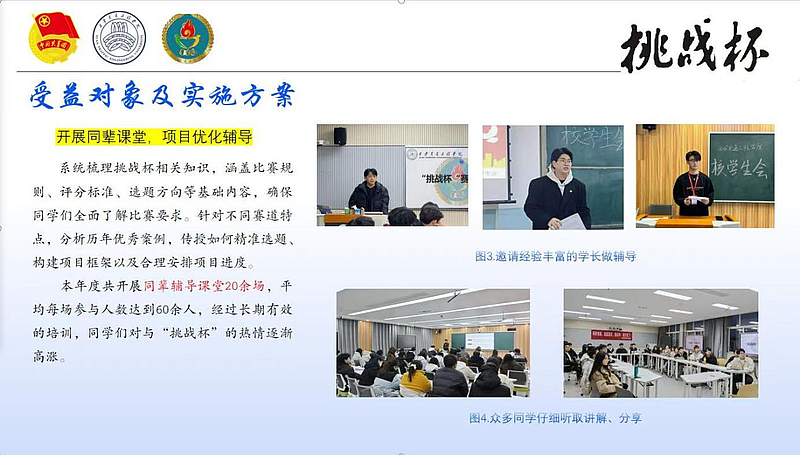 在具体服务实践中,校、院两级学生会精准对接同学需求,形成差异化服务格局。校学生会针对“挑战杯”竞赛备赛痛点,以“同辈赋能+专业支撑”构建“精准赋能”竞赛服务新模式:通过多元学习适配个性需求,以同辈课堂、专家讲座、校际交流覆盖不同学生能力短板;靶向发力直击竞赛核心,紧扣学术研究、创新设计、商业策划关键要求设计课程;聚合校内外资源筑牢后盾,解决备赛“缺经验、少指导、没资源”难题,切实提升学生学术创新与创业策划能力,推动“以赛促学、以学促长”,将学生会服务宗旨贯穿竞赛赋能全过程。