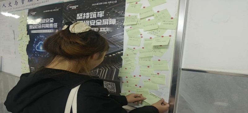 人文与管理学院创新采用“点、线、面”相结合的方式,让网络安全教育触达每一位学生。“点”上,各年级辅导员深入班级开展主题教育班会,结合电信网络诈骗、网络借贷陷阱等真实案例,引导学生讨论“辨别网络信息真伪”“保护个人隐私”等话题,筑牢思想“防火墙”;“线”上,充分发挥学生党员先锋模范作用,组建“党员网络安全宣传先锋队”,深入学生宿舍开展“送学上门”微宣讲,用通俗语言普及安全常识,演示防护技巧,打通宣传“最后一公里”;“面”上,组织各班级利用晚自习观看网络安全警示教育视频,直观呈现网络风险的隐蔽性与危害性;同时,在教学楼大厅设置“安全宣言”便利贴墙,“不轻信、不转账、不泄露”“强密码,守隐私”等一句句承诺贴满展板,凝聚起全院学子共建清朗网络空间的共识。