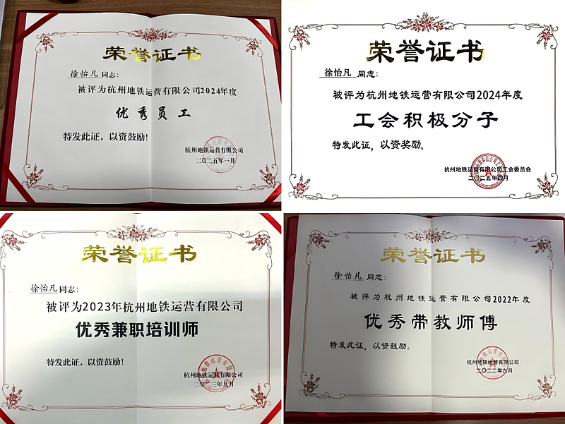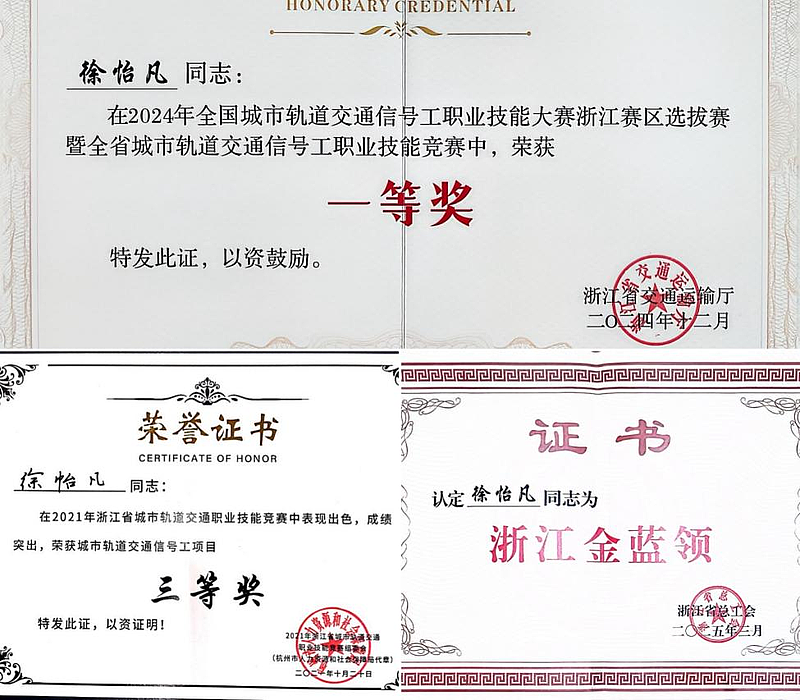 在技能竞技的赛场上,徐怡凡同样展现出过人的专业实力,用沉甸甸的奖项和荣誉,彰显了西交院人的卓越风采。2021年,他在浙江省城市轨道交通技能竞赛信号工项目中崭露头角,荣获三等奖;2024年,他再攀高峰,于浙江省交通运输行业职业技能大赛信号工赛项中力克群雄,勇夺一等奖,并获评“浙江省金蓝领”称号。此外,他在公司内部各类技能比武中同样表现突出,16次斩获荣誉,先后获评杭州地铁运营有限公司“优秀员工”“优秀带教师傅”“优秀兼职培训师”“工会积极分子”等多项称号。