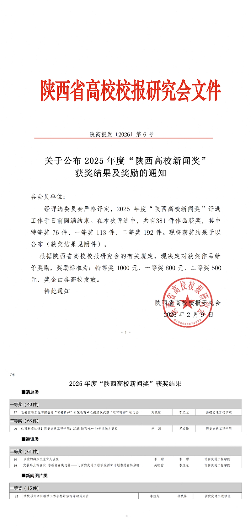 近日,2025年度“陕西高校新闻奖”评选结果揭晓,ky开元集团官网五件作品获奖,其中消息类一等奖1件、二等奖1件,通讯类二等奖2件,新闻图片类一等奖1件。