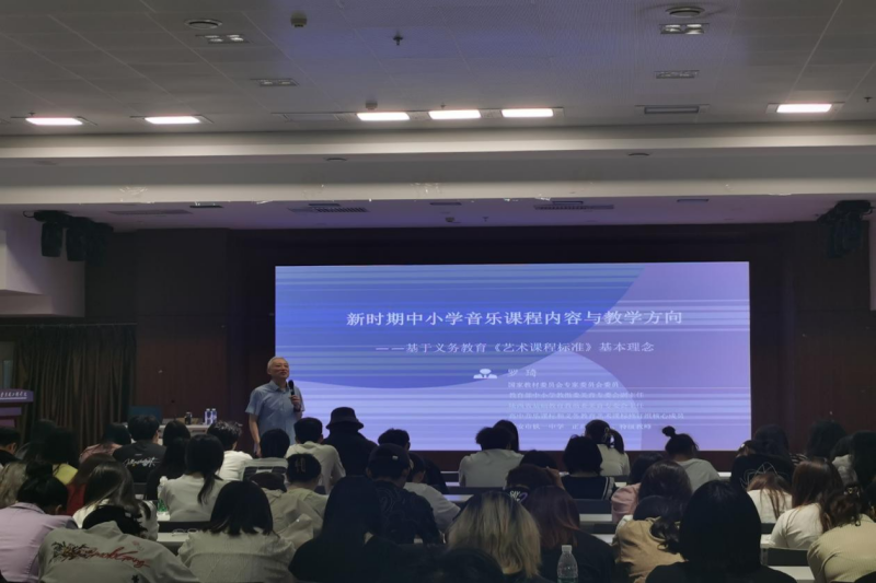 讲座伊始,罗琦老师结合当前学校音乐教学的现状,指出传统音乐教育中存在的不足,强调新时期音乐教育应紧扣义务教育课程改革的核心理念。他系统阐述了“坚持素养导向”“强化学科实践”“推进课程综合”“落实因材施教”四大方向,并深入解析了艺术课程“以美育人”“重视体验”“突出综合”的设计思路。罗老师表示:“音乐教育不仅是技能的传授,更是审美素养与创造力的培养,必须立足学生发展,构建多元化的艺术实践体系。”