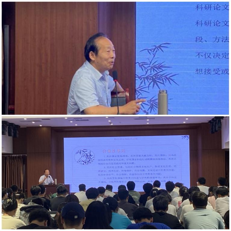 段联合教授强调科研论文的写作水平不仅决定着学术思想表达的准确性、完美性,同时决定着学界对科研主体的思想接受或成果认同程度,决定着思想、成果传播的广度与历久性。同时与同学们分享了题为“悟文章之道”的自创诗歌:“文得大气始含章,纵揽山川辟径荒。首段开篇结彻响,末节综括入盈囊。循纹析理究精妙,沿壑求泉觅醴香。龙阵连环多顾盼,精琢久酿自流芳。”以诗歌的形式,形象生动的向学生们道出了写出一篇好文章的不易,鼓励学生要有“锲而不舍”的品格,潜心于知识之一隅,长期坚守必有厚报。