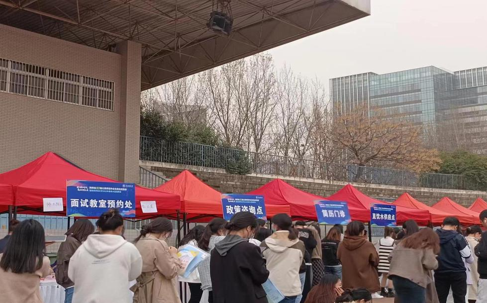 在陕西师范大学,主办方在招聘现场设置了面试预约室、面谈室、打印点等便民服务设施。此外,为保障现场卫生环境与现场秩序,在各交汇处设置了垃圾桶和志愿者以提供相应的服务与便利。