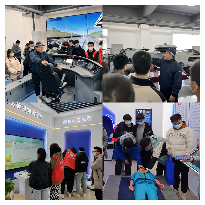 最后,研学团走进西安动车段实训楼,在一线工作人员的引领下,认识动车受电弓及转向架;随后参与体验了模拟驾驶、VR互动、安全帽撞击、触电体验、心肺复苏等项目,并进一步学习了道路交通安全知识、常用急救知识、专业交通知识等内容。
