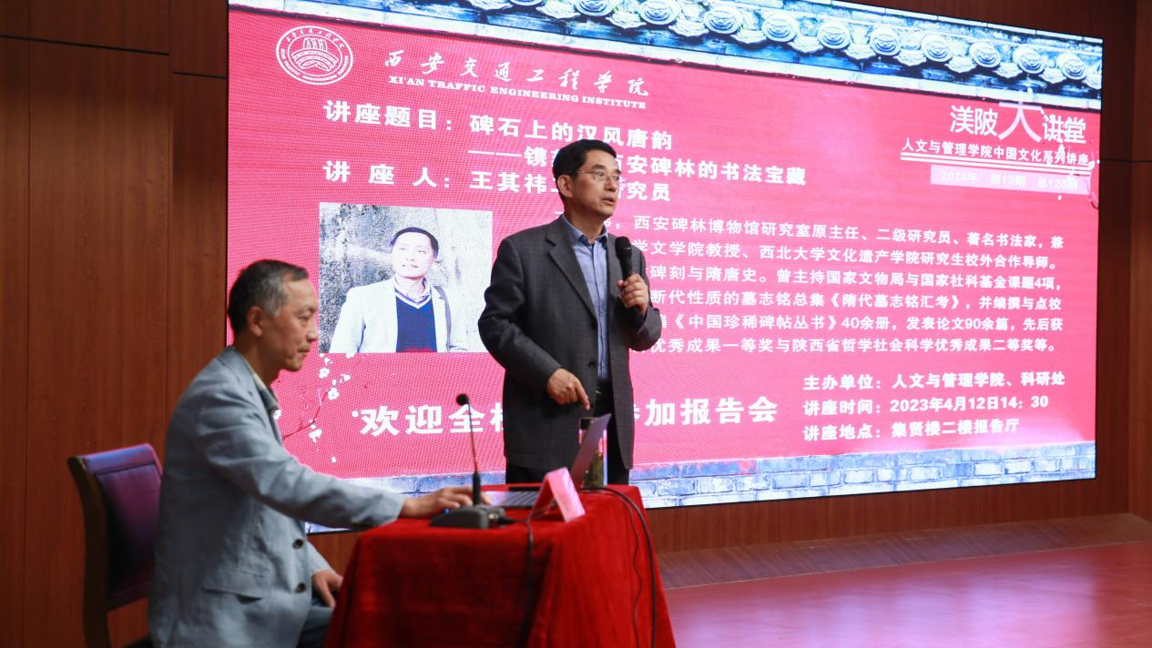为深入开展新时代文明实践活动,弘扬优秀传统文化,4月12日,人文与管理学院邀请到西安碑林博物馆研究室原主任、二级研究员、著名书法家,兼任陕西师范大学文学院教授、西北大学文化遗产学院研究生校外合作导师王其祎,在集贤楼二楼报告厅举办了中国文化系列讲座-《碑石上的汉风唐韵》,全校300余名师生到场聆听了讲座,讲座由人文与管理学院院长赵德利主持。