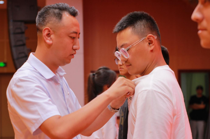 院长李乃乾、党委书记张斌为新生代表佩戴院徽,希望同学们谨记校训、院训的教诲,在新的征程里行稳致远。