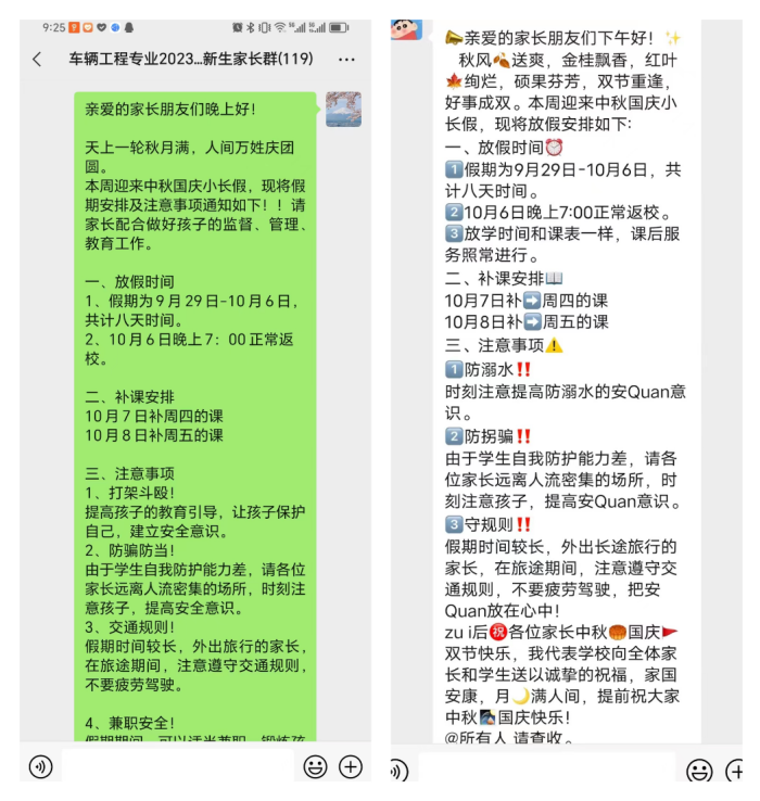 学院持续与学生家长共同保障学生假期安全。通过使用微信群、电话等交流方式及时与家长保持联系,了解学生情况和需求,让学生家长第一时间了解学生动态,发布学院放假安排工作及安全教育的通知,提升家校共育的时效性,使家校沟通更加高效顺畅,将安全防范做在前头、将安全教育做在日常,查漏补缺、防微杜渐,落细落实各项安全工作,为学生健康成长和平安校园建设保驾护航。