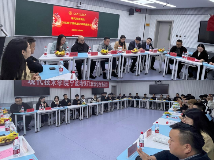 10月18日下午,现代技术学院召开2022级宁波市轨道交通订单班学生座谈会。宁波市轨道交通集团有限公司运营分公司一中心站务一车间主任王胜和、智慧运营分公司站务一中心站务一车间副主任陈江、运营管理中心徐静静、现代技术学院院长都娟丽、党委书记兼副院长田宏顺、学生就业指导服务中心外联科科长冀世保、现代技术学院团总支书记黄晶、辅导员蔡莎及2022级宁波地铁订单班全体同学参加。会议由副院长党亮亮主持。