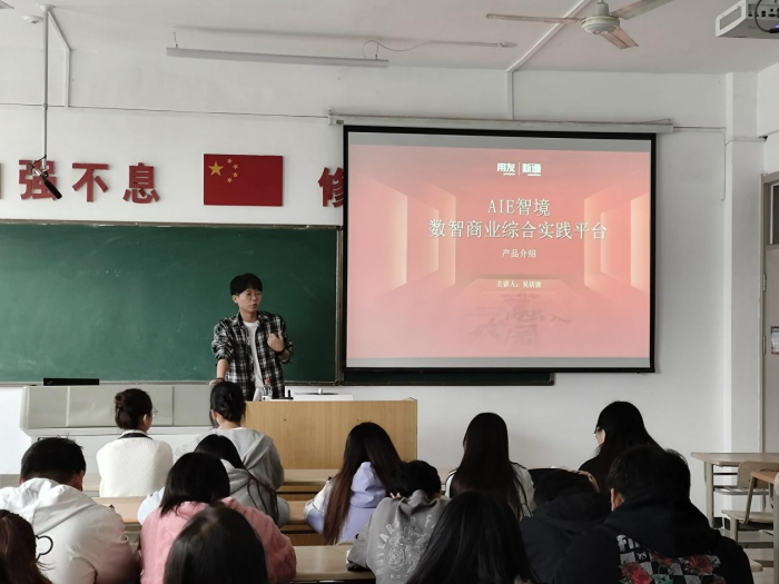 “AIE智境”综合实践教学课程,依托用友新道公司研发的智境商业综合实践平台,打造应用型数智人才培养模式。项目围绕数字孪生、VR、AI等新一代教育技术,融合大数据、人工智能、区块链等新一代企业级数字化技术,组建多个仿真生产制造公司和多个仿真外部经济组织或机构,通过以“数字理论知识”“职业素养”,与“动手技能”的有机结合,从现实岗位工作内容、管理流程、业务单据着手,将经营模拟与现实工作接轨,进行仿真经营和业务运作展示,以期培养学生成为复合型数智商业人才。