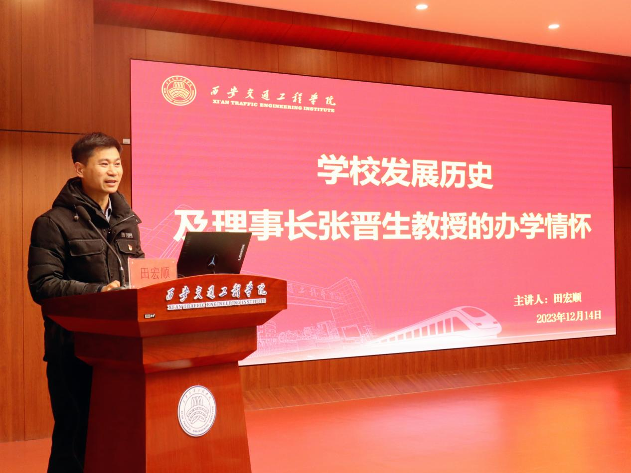 鉴古而知今,彰往而察来。寻忆校史,传承精粹,田宏顺详细讲述了从“知校史,追根溯源”“明校情,翱翔腾飞”等方面讲述了学校的发展历史,从建校前时代背景,到学校“创业期”、“发展期”、再到“跨越期”,他用一个个真实故事,展示了学校老一辈人艰苦朴素、勇挑重担的光辉形象,让全体师生对学校自1994年创办以来廿九年的发展历程、辉煌成就和精神内涵有了更为全面和清晰的认识,对学校创始人理事长张晋生教授的“两心”办学、教育情怀和铁路情结深受感动。