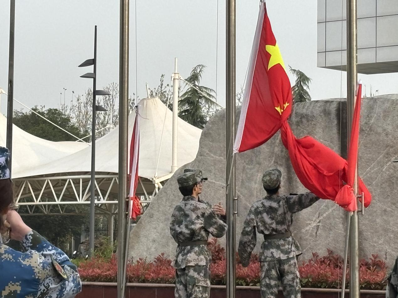 本次国旗护卫队的旗手们着装整齐,迈着矫健的步伐,护卫着鲜艳的五星红旗入场;伴随着嘹亮的国歌声,五星红旗在晨光中缓缓升起,全体师生肃立,行注目礼。