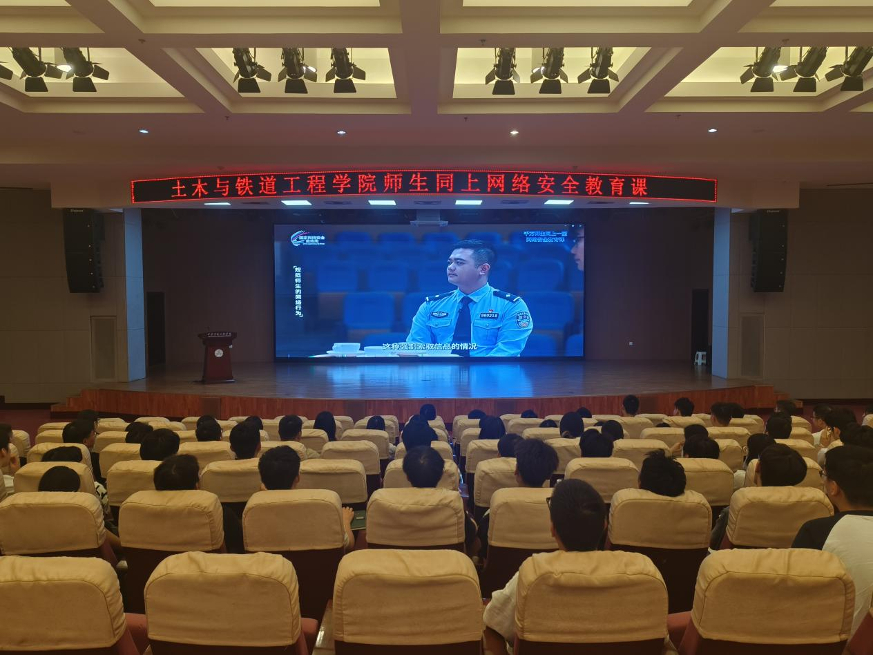 9月13日晚上,土木与铁道工程学院组织辅导员和班级学生代表在学术报告厅共同收看了由教育部思想政治工作司指导,中国大学生在线推出的“千万师生同上一堂网络安全教育课”。本次网络安全教育课邀请国家反诈中心民警林德海警官、北京理工大学网络空间安全学院特别副研究员曾亮老师、天津理工大学马克思主义学院团总支书记、天津青年五四奖章获得者万柯彤老师,从防范电信诈骗、个人信息保护、规范网络行为等方面讲授网络安全教育公开课,提醒师生树立网络安全意识,增强自我保护能力,营造安全上网、依法上网的良好校园氛围,营造清朗校园网络环境。通过观看学习让同学们通过视频方式更生动了解了网络安全相关知识,提升安全用网、善于用网、文明上网能力素养。