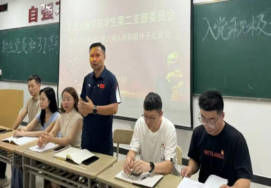 交通运输学院学生支部委员会开展新生党员和31期入党积极分子见面会暨表彰大会。学院党委书记胡省利、党委组织委员张欢、支部书记李瑞霞、组织委员郝志超、宣传委员李亚楠、纪检委员杜强强参加会议。会议由郝志超同志主持。李瑞霞同志对新生党员及入党积极分子的到来表示热烈欢迎和衷心地祝贺,鼓励新生党员在接下来的学习生活中找准目标、努力奋进,强调大家要深入学习二十届三中全会精神,以优异成绩为新中国成立75周年献礼,为党和国家的事业贡献力量。组织委员郝志超同志宣读表彰,向他们学习发挥先锋作用,引领支部建设、担当支部领头人。党委书记胡省利同志进行总结,他通过阐述就业形势,提醒同学们要提前规划职业生涯,并不断提升专业技能与综合素养,珍惜当下时光,扎实基础,鼓励大家积极参与实践活动,在担当使命中奋进新征程,以实际行动赓续共产党人的红色血脉!