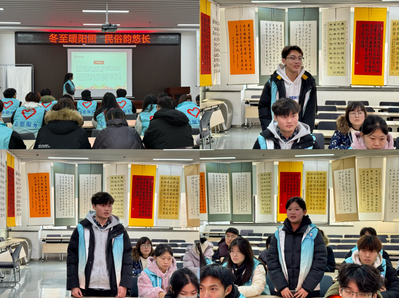 活动在一片期待与热情中拉开帷幕。志愿者代表陈先超同学以生动的PPT为媒介,将冬至的天文现象、历史典故、丰富多样的习俗等娓娓道来,仿佛带领大家穿越千年,共同探寻冬至民俗文化的奥秘。她的讲解幽默风趣,穿插的小故事更是让人忍俊不禁,现场气氛热烈非凡,听众们时而点头赞同,时而捧腹大笑,提问环节更是争相发言,互动频频。