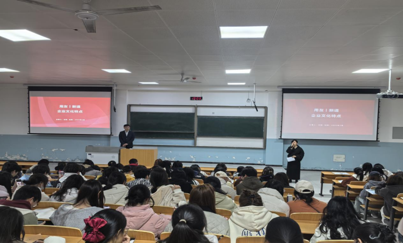 随后,任总从用友新道公司的发展历程入手,详细介绍了公司在企业数字化服务领域的领先地位及其核心业务。在谈到企业文化时,任总重点分享了用友新道的“创新、合作、担当、共赢”文化理念。他通过生动的案例和实际项目经验,向学生们展示了企业文化在企业发展中的重要作用,并鼓励大家在未来的职业生涯中注重团队合作与创新精神的培养。