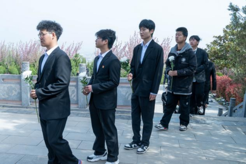 上午十时,祭奠仪式在烈士纪念碑前正式开始。仪式第一项,全体默哀一分钟,表达对烈士的深切缅怀。随后,由党委书记兼副院长张斌同志带头进献花篮,各师生代表将象征崇敬与追思的花篮与花束轻轻摆放在纪念碑基座上。朵朵白菊寄托着师生对烈士的无限哀思,也承载着新时代青年接续奋斗的誓言。最后,学生代表张泽恩在发言中回顾了革命先烈的英勇事迹,号召同学们以先烈精神为指引,在科技报国的道路上勇毅前行。他的声音铿锵有力,在陵园上空久久回荡,激起在场师生强烈的情感共鸣。