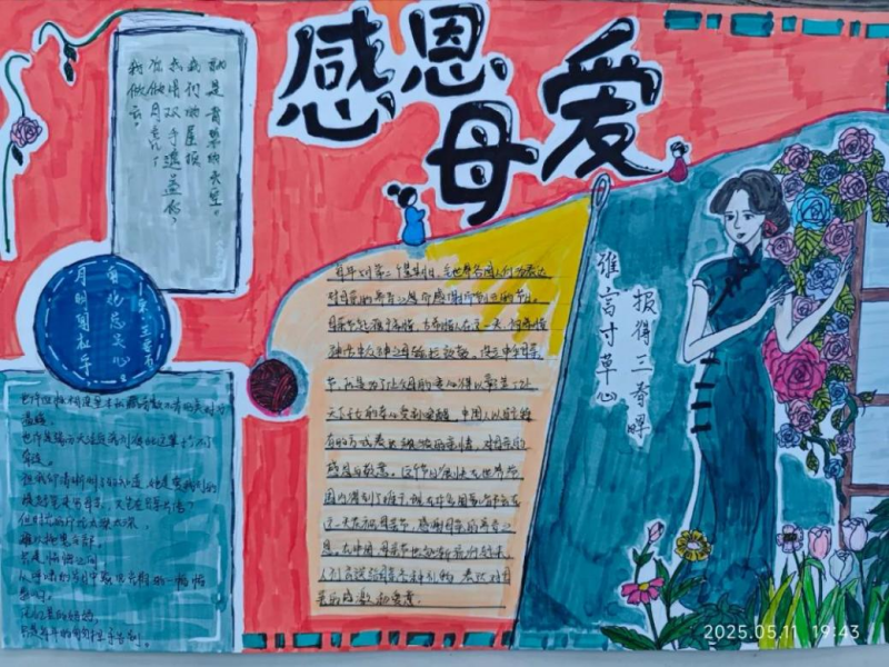伏案执笔间,同学们将绵绵情意倾注于方寸之间。有人引用《游子吟》中“临行密密缝”的诗句,工笔描绘出深夜灯下缝衣的母亲身影;有人以漫画形式再现“孟母三迁”的故事,于俏皮笔触中传递家风智慧;还有同学将母亲照片融入剪纸艺术,并配以“青丝化雪终不悔”的原创诗文,情感真挚,动人心弦。