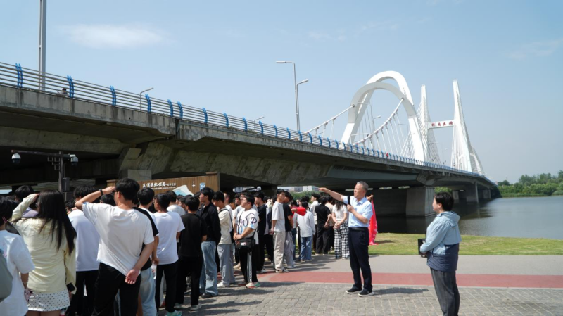 聚焦现代工程,践行工匠精神。实践活动的最后一站是汉中市地标性建筑——龙岗大桥,该桥全长1022米,是连接汉台区与南郑区的交通枢纽。桥体集斜拉桥、悬索桥、钢混叠合梁桥、混凝土连续梁桥四种桥型于一身,为亚洲首座三塔斜拉一字锚式悬索组合体系桥,呈现“鱼跃龙门”的生动造型。师生们在土木与铁道工程学院院长张科强和铁道工程专业教师王倩的讲解下,深入了解了桥梁抗震设计、BIM技术应用等工程细节。张科强院长强调,“龙岗大桥的建造过程攻克了多项技术难题,这正是‘工匠精神’的当代体现。”“我们培养的不仅是技术人才,更是肩负民族复兴使命的‘红色工程师’。”