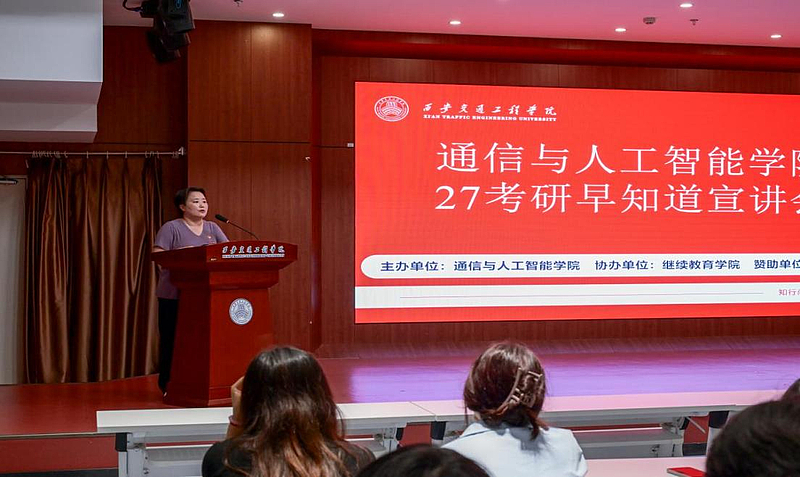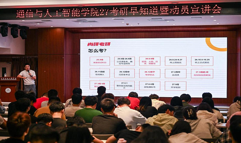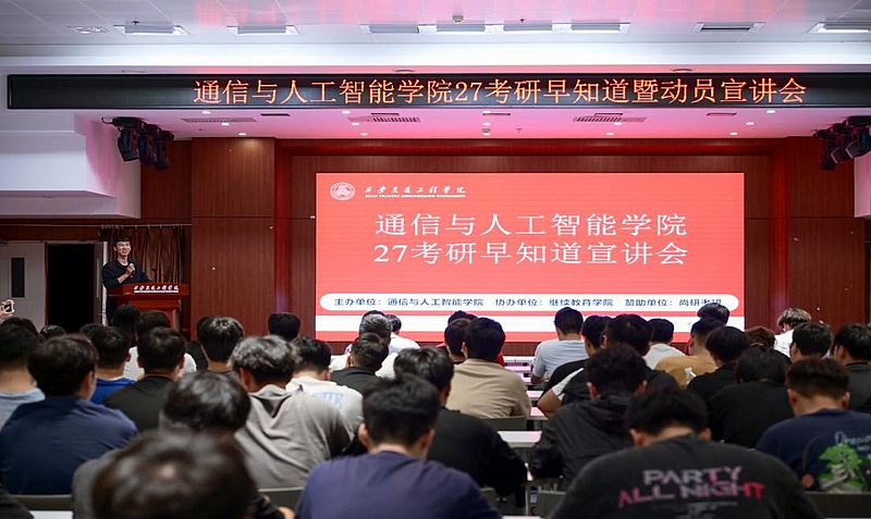 讲座现场座无虚席,气氛热烈。继续教育学院黄宏彬老师首先深入分析了通信与人工智能领域的考研形势与就业前景。学院党委书记张雯雯的动员讲话更是情深意切,她不仅介绍了学院为考研学子提供的自习室等硬件支持,更从人生成长的角度勉励大家:“考研是一场淬炼心智的修行,这种‘明知山有虎,偏向虎山行’的勇气,正是当代青年最可贵的锋芒。”