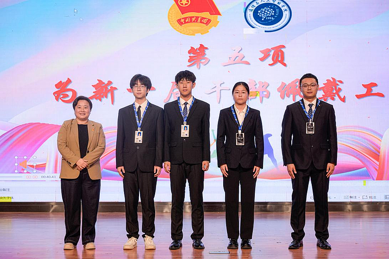 大会在庄严的国歌声中拉开帷幕,全体参会人员齐唱国歌,让爱国情怀烙进每个人的心中。随后,2024-2025 学年学生会执行主席巨锋上台总结了过去一年学生会在组织建设、活动开展、志愿服务等方面的成长与收获,更以自身经历激励新一届成员,号召大家扛起责任、再创佳绩。接着,学管秘书张欢宣读表彰决定后,“共青团之星”“支持共青团工作的好班长”“魅力团支书”“优秀学生干部”等获奖代表依次登台领奖,他们在过去一年中担当责任、服务集体,用实际行动诠释了学生干部的使命。之后,学院党委书记张雯雯为新任学生干部佩戴工牌,象征着新的责任与使命正式传递。