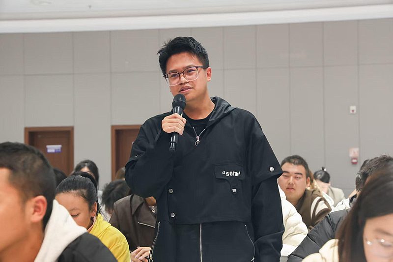 互动环节将现场气氛推向高潮。围绕“学生团员如何在日常体现先进性”这一问题,同学们各抒己见。机械与电气工程学院郑智华同学的分享尤为精彩,他以志愿服务和学科竞赛的亲身体验,生动诠释了“小事做实、难事敢上”的行动准则,其真诚而务实的发言赢得了阵阵掌声。主讲人高度评价了同学们“知行合一”的思考,并号召大家见贤思齐,于细微处见精神,于实践中长本领。
