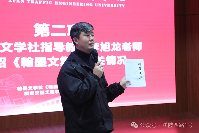 活动现场还举行了翰墨文学社《翰墨文集》出版发布会,2023届翰墨文学社社长、陕西省青年文学协会会员谢婉萍、2023届融媒体中心副主任王思玥发来祝福视频,祝贺翰墨文学社《翰墨文集》的正式出版。李旭龙介绍了《翰墨文集》的组稿、编辑、印刷出版的始末,阐述了《翰墨文集》出版对校园文化和对翰墨文学社成员开展文学创作的重要意义,并对参与本书组稿、编辑、排版、校对的工作人员,指导支持翰墨文学社和《翰墨文集》出版印刷工作的学校党政办、团委、融媒体中心表示感谢。2025届翰墨文学社社长王海江做了主题发言。