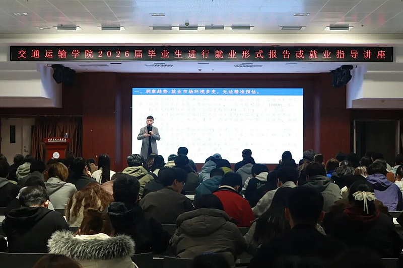 交通运输学院2026届毕业生就业形势报告暨就业指导讲座近日在集贤楼报告厅开讲。本次活动由学院学工组长肖茹峰主持,特邀资深就业指导老师关龙主讲,全体2026届毕业生到场参与,讲座围绕就业市场趋势、行业岗位布局、求职心态调整等内容展开,为学子们梳理了清晰的求职方向。
