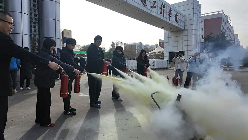消防演练学习环节是本次系列活动的重点。学院邀请校保卫处消防专员现场指导,详细讲解了不同类型灭火器的适用场景、操作步骤(提、拔、握、压)以及火灾现场的逃生技巧。在模拟火灾场景中,师生们按照指导分组进行实操演练,从发现火情、拨打火警电话,到正确使用灭火器扑灭火源、低姿弯腰快速疏散,每个环节都有条不紊。通过“理论讲解+实操体验”的模式,大家直观掌握了火灾应急处置的关键流程,有效提升了面对突发火情时的心理素质与实操能力。