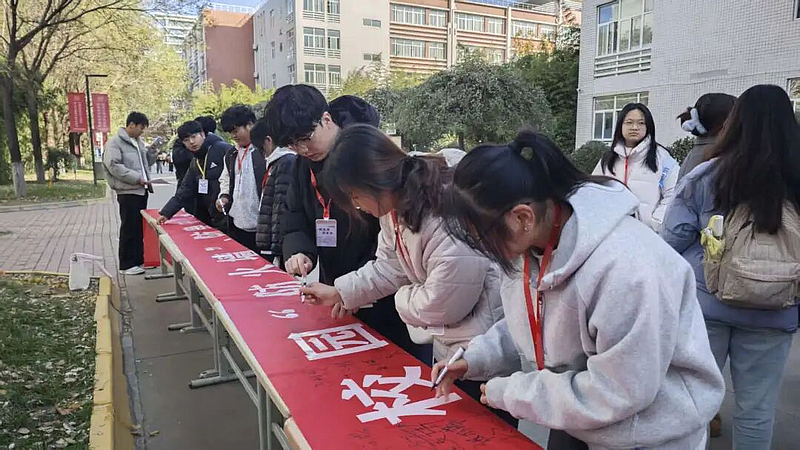 签名活动现场,“全民消防、生命至上、筑牢校园‘防火墙’,防患于未‘燃’”的横幅格外醒目。师生们有序排队,郑重地在横幅上签下自己的名字,每一笔都承载着对消防安全的重视与承诺。现场工作人员向大家细致讲解日常校园生活中容易忽视的消防隐患,如电器使用规范、易燃物品存放等注意事项。签名不仅是一种仪式,更是一份责任的传递,让“安全第一,预防为主”的理念深植人心,引导师生自觉成为消防安全的践行者与传播者。
