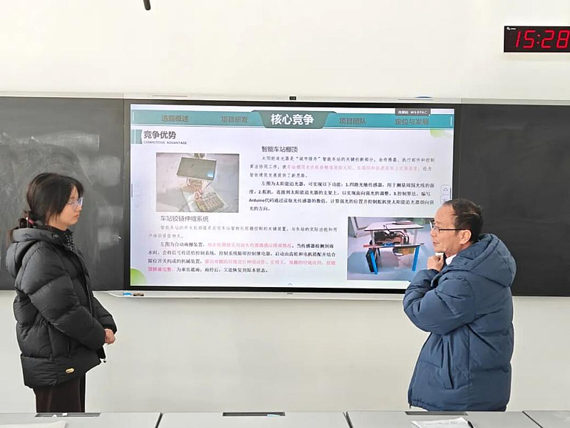 本次打磨答辩严格对标省级赛事流程,设置项目陈述、现场问辩、精准指导三大环节。参赛团队紧扣“智能车站”建设需求,从旅客服务智能化、运营管理高效化、安全防控精准化等维度进行系统汇报,通过PPT动态演示和系统功能模拟,重点展示了天气检测、结构创新、绿色能源利用等模块的整体架构、技术路线和预期效益,充分展现了学生扎实的专业基础和良好的工程实践能力、创新意识。