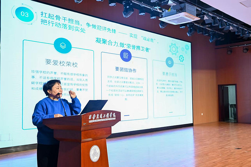 会议伊始,张雯雯围绕“吃透评估要求,明确行动指南”对评估工作展开详细介绍,为学生骨干清晰梳理迎评工作的核心要点与行动方向。讲解内容聚焦校情认知的“2个百分百”,要求学生骨干熟知学校核心文化与专业基本情况:一方面要深研校训“自强不息,修德载物”、大学精神“笃实惟新,负重图强,驰而不息,交通报国”、道钉精神“自身硬,扎得稳,靠得住”及校风教风学风等精神内核;另一方面要掌握专业培养目标、实践教学特色、一流专业与课程建设情况等专业核心信息。在办学特色上,学校面向轨道交通行业构建特色实践育人体系,坚持产教融合、校企协同育人,打造“真题真做”的实习实训模式;实践教学体系围绕应用型人才培养,搭建起“一个目标、三种能力、四个层次、五个平台”的完整架构;学生服务保障更是覆盖资助、心理健康、就业指导等多个维度,为学生成长保驾护航。