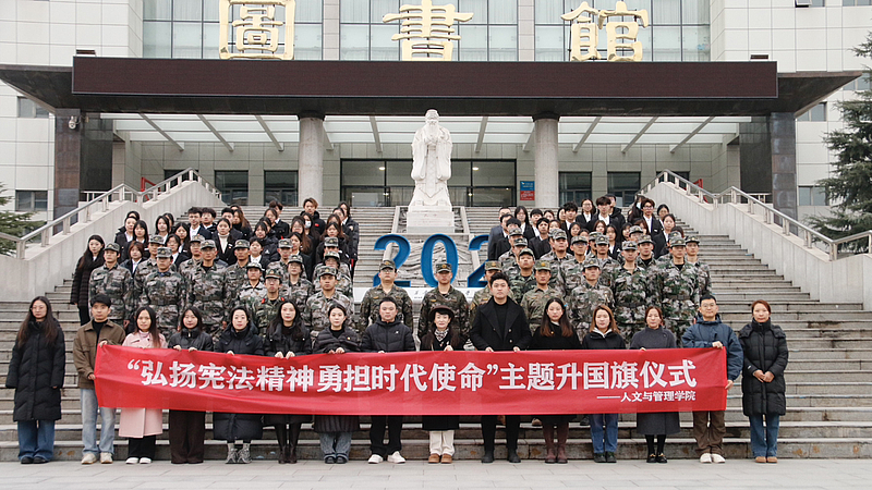 为大力弘扬宪法精神,引导青年学子增强法治观念、勇担时代重任,12月8日,人文与管理学院在学校北广场隆重举行“弘扬宪法精神,勇担时代使命”主题升旗仪式。人文与管理学院党委书记兼副院长李沙沙、专职组织员丰硕、全体辅导员和2025级学生共同参加,仪式由人文与管理学院团总支书记杜涵静主持。