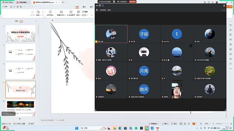 近日,为深入贯彻落实学校《关于切实做好寒假学生安全管理工作的通知》要求,土木与铁道工程学院高度重视、迅速行动,组织全体辅导员通过线上形式召开假期安全教育主题班会,围绕反诈防骗、防范邪教渗透、消防安全、交通安全等重点领域,面向全体学生开展了一场内容丰富、形式生动的专题安全教育,全面筑牢学生假期安全思想防线,以实际行动守护学生平安离校、安心度假。