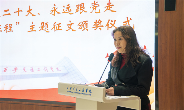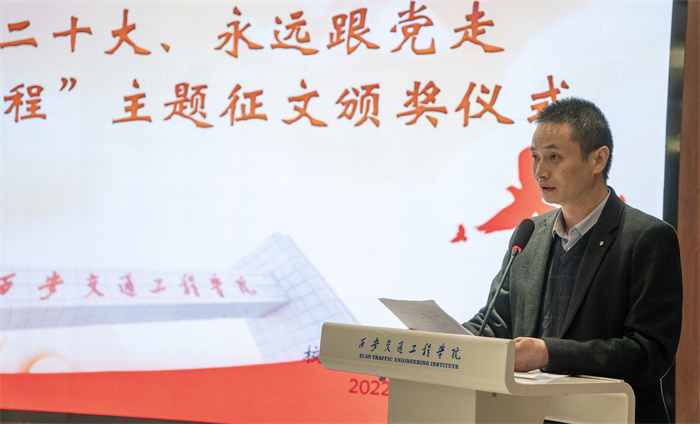 颁奖仪式上,与会领导为获奖教师颁奖;党委宣传部部长界威锋宣读了本次征文活动评选结果。据悉,本次征文活动自9月份启动以来,受到广大教职工的广泛关注和大力支持,活动收到的稿件数量多、质量高。经评审委员会严格审查评比,共评出一等奖三篇、二等奖五篇、三等奖七篇。其中,马克思主义学院段联合院长的文章《雄鹰振翅当高翔》,党政办李旭龙老师的文章《弘扬“道钉精神”,厚植家国情怀 ——以一枚“道钉”的形象,扎在祖国最需要的地方》,人文与管理学院魏子涵老师的文章《征途漫漫从头越,奋楫扬帆向未来》获得一等奖。