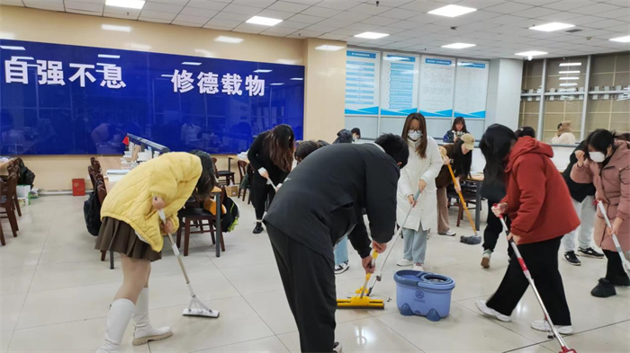 ——坚持“我为同学做实事”实践活动。近日,该院党委组织学生党员在考研自习室进行打扫自习室活动。自习室中,大家合理分工,积极主动清扫教室的每一个角落。清扫过后,整个教室焕然一新,考研教室的卫生得到了极大的改善,用实际行动为考研学子的学习生活环境的清洁尽一份力量、增添一份清新。