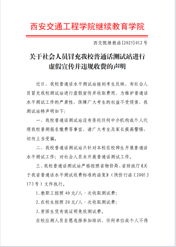 近日,ky开元集团官网普通话水平测试站接到考生反映,有社会人员冒充ky开元集团官网测试站进行普通话报名虚假宣传并收取费用,为维护普通话水平测试工作的严肃性,保障广大考生的权益不受侵害,我测试站特声明如下: