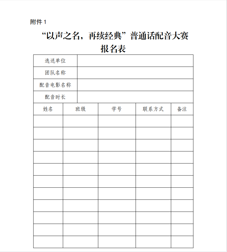 (2)各学院自行组织初赛,最多选出 2 支优秀的队伍进入决赛,并于 9 月 20 日前将普通话配音大赛报名表(附件 1)交校务楼 314 办公室。决赛时间 10 月中旬线下举行,具体安排另行通知。